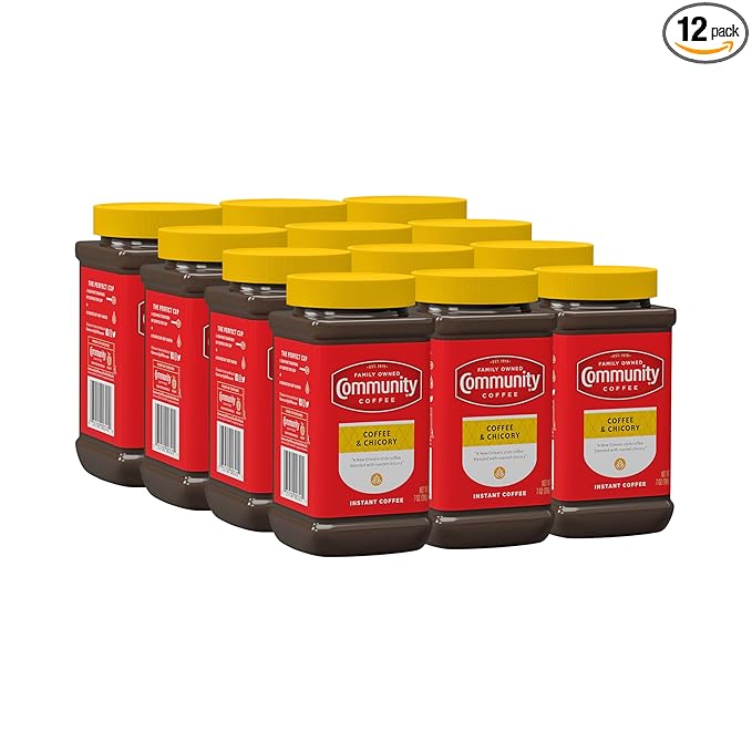 Community Coffee Coffee and Chicory Instant Coffee, Medium Dark Roast, 7 oz Jar (Pack of 12)