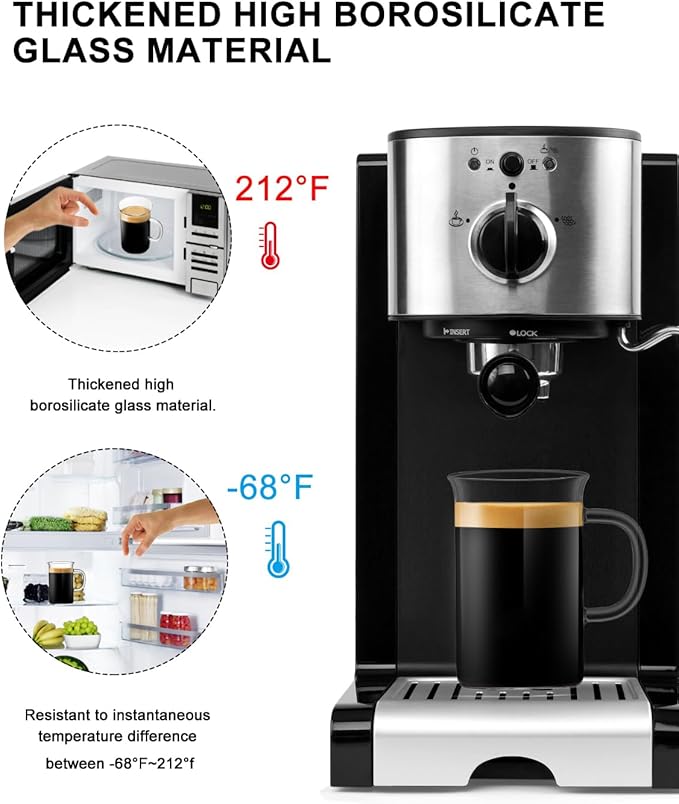 - HEALTHY AND ENVIRONMENTALLY FRIENDLY - Whether at home or in the office,this borosilicate coffee glass has super chemical stability and strong resistance to acids, alkalis and preservatives,so you don't have to worry about harmful chemicals getting into your stomach by mistake.Therefore,this healthy and environmentally friendly transparent coffee cup will become the first choice for coffee lovers.