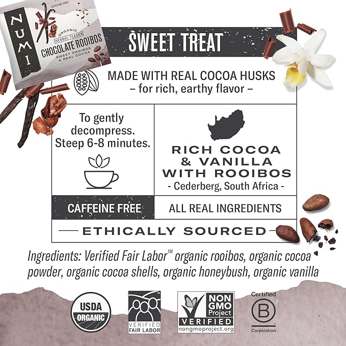 Numi Organic Rooibos Tea Variety Pack, 18 Tea Bags (Pack of 3), Chocolate Rooibos, Rooibos Chai, Rooibos (Packaging May Vary)
