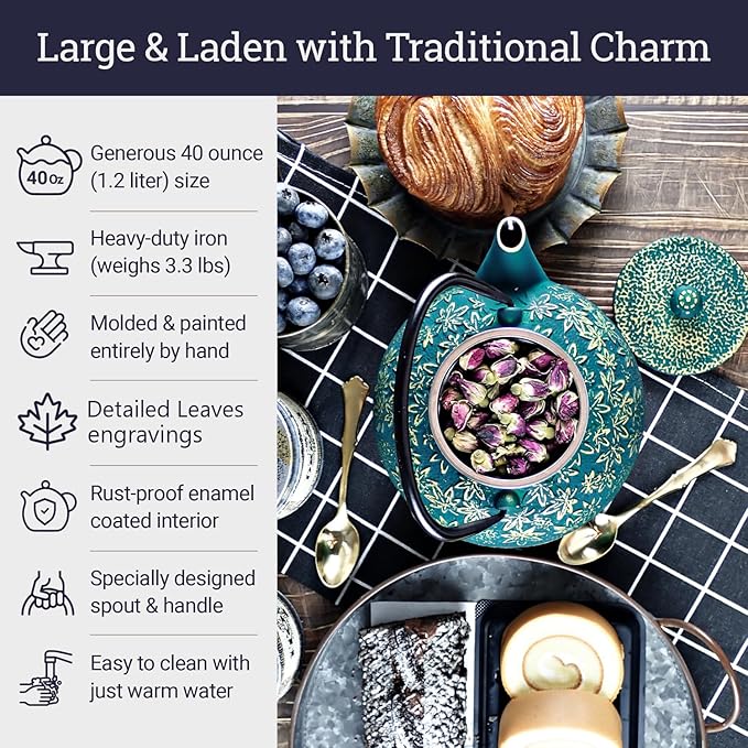 - Crafted by Hand from Start to Finish: Our green tea pot is more than just a kettle; it's a handcrafted piece of art; Each green tea kettle is molded from heavy-duty iron, carefully hand-painted, and beautifully engraved with multiple leaves, symbolizing health and happy relationships