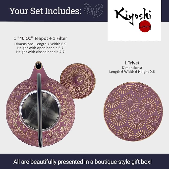 - Paired with a Matching Trivet & Infuser: To complete the set, each Japanese cast iron teapot comes with its own matching trivet to protect surfaces from heat; And for those who love the fresh flavor of loose-leaf teas, we've included a stainless steel tea infuser
