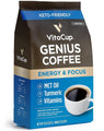 - ENERGY & FOCUS: Genius Coffee is here to elevate your day. Gourmet ground coffee infused with superfoods MCT Oil, Cinnamon, and Turmeric provide healthy fats that support lasting energy and focus.