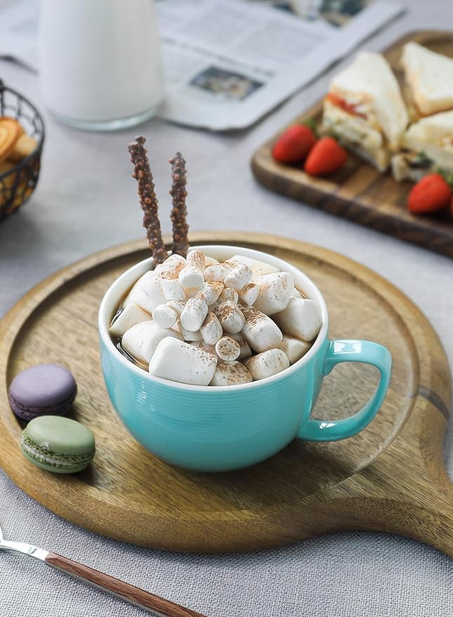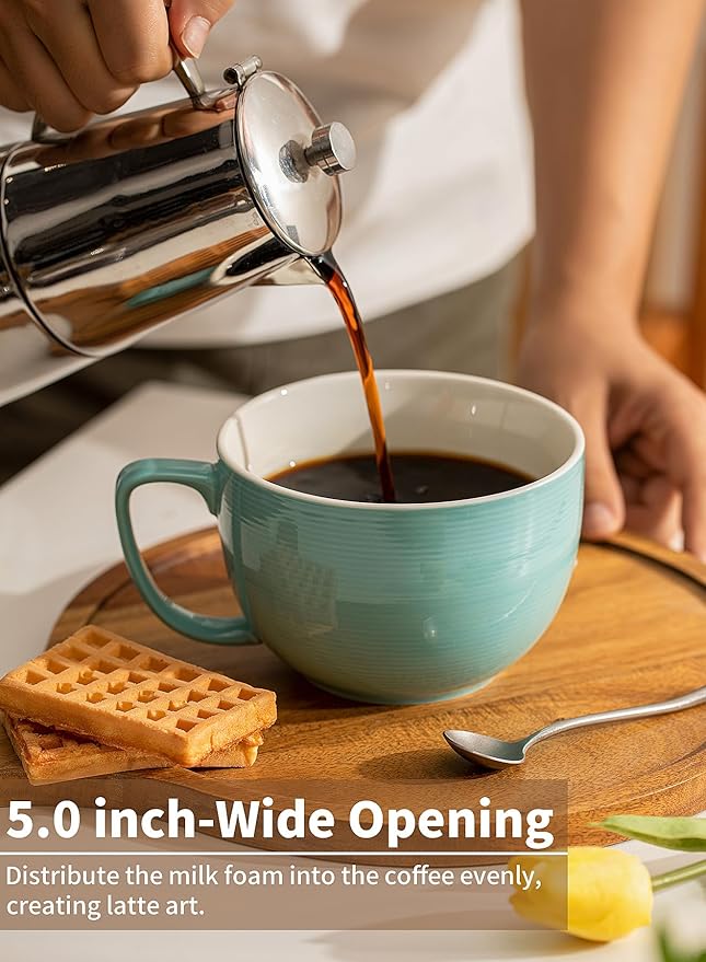 Teocera 24 oz Soup Bowls with Handles, Porcelain Large Coffee Mug Set, Jumbo Mugs, Soup Bowls Mugs set of 4 for Coffee, Oatmeal, Stew - Striped Design, Turquoise