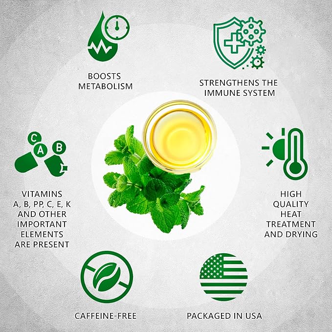 - NO ARTIFICIAL INGREDIENTS ADDED: Peppermint tea contains no harmful colors - and has a soothing effect on your body, is naturally caffeine-free and doesn’t contain any sugar Collectively, mint tea is healthy tea has refreshing, cooling, minty taste.