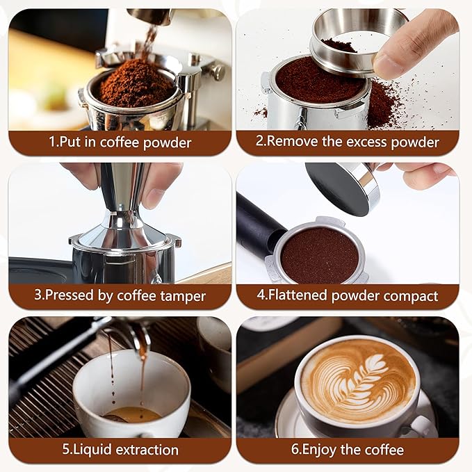 - Solid And Good Weight: The 58 mm coffee tamper is made of stainless steel - a sturdy metal tamper. It is heavy enough that you don't even need to press down. The weight itself is about all you need. With a tiny tap the coffee is very packed