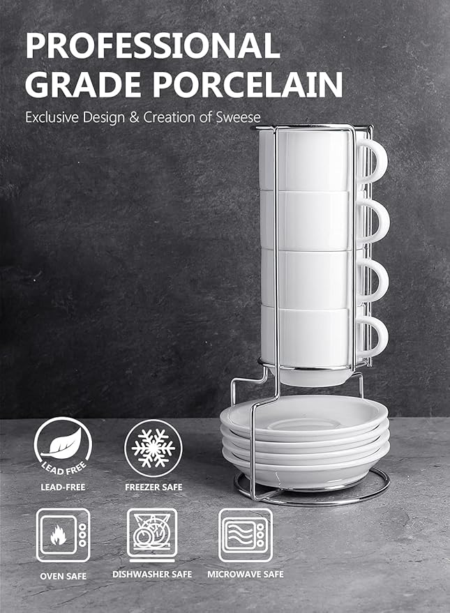 Sweese 4 Ounce Porcelain Stackable Espresso Cups with Saucers and Metal Stand Set of 4, White