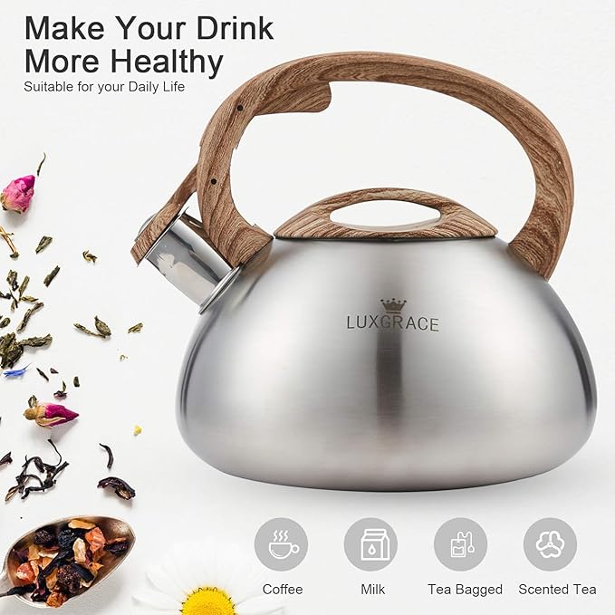- 【Perfect Whistling Sound】The tea kettle will release a loud whistle when the water has reached a boiling point. When you focus on your housework, movies, music, or anything else, the teapot will whistle to remind you when the water is boiling and you won't miss it. (Tip: Just fill up 80% of the capacity on tea kettle so that the water kettle can whistle when water is boiling.)