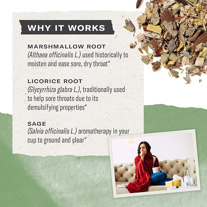 - Organic Throat Relief Tea: Our Throat Soother herbal tea blends sage, licorice root, marshmallow root, cinnamon and clove for a comforting cold and flu season tea; Delicious with honey and lemon