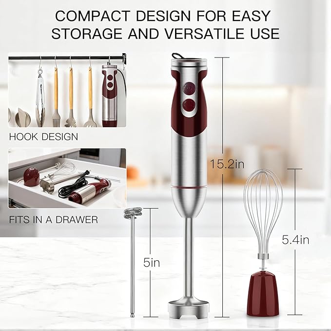 3- in-1 Immersion Hand blender, Powerful MOTOR & Stainless Steel Stick Blender, 4 Sharp Blades with Whisk, Milk Frother Attachments