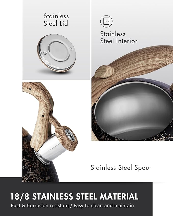 - Anti-Rust Finish: Stylish tea kettle electroplated for longevity. Professional food grade finish and 18/8 stainless steel craftsmanship, ensures this kettle is rust & corrosion resistant.