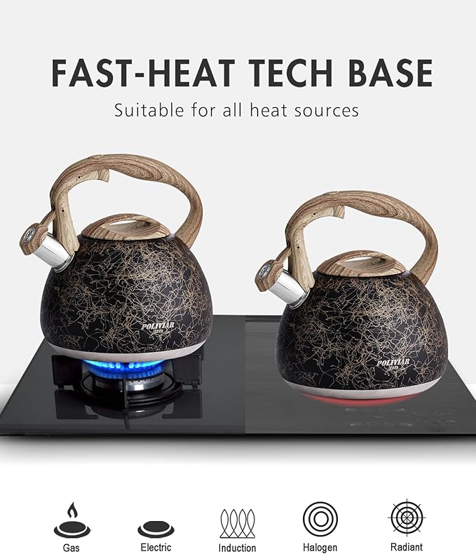 - Fast Heat Base: The tea kettle designed with a generous 8 in base can maximize the heat conduction to increase the efficiency of boiling. High grade stainless steel is suitable for any heat source including gas, electric and induction.