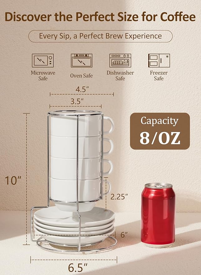 - 【Stackable & Space-Saving Design】All cups and saucers neatly stack on the sleek metal stand, saving valuable counter or cabinet space while keeping your coffee area organized and stylish
