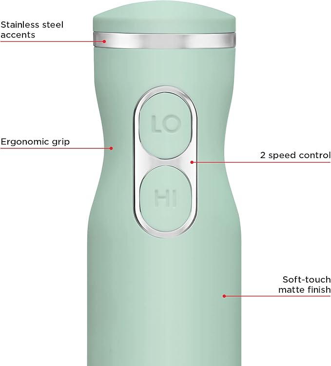 - BETTER HOME BLENDING: The high-speed, quiet 300-watt immersion blender transform food and crushes ice at the push of a button. Enjoy an easy blending process with 2 one-touch speeds: HI & LO. The sleek, ergonomic easy-grip handheld design with soft-touch finish was built to put pureeing power in the palm of your hand, for even results in seconds.