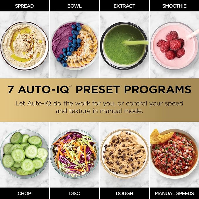 - 7 PROGRAMS: Preset Auto-iQ programs for one-touch smoothies, extractions, bowls, spreads, chopping, and food processing.