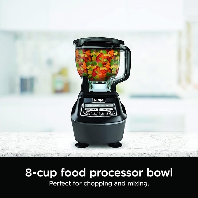 - WHAT'S INCLUDED: 1500-Watt Motor Base, 72 oz. Total Crushing Pitcher 64 oz. max liquid capacity, 8-Cup Food Processor Bowl, 16 oz. Nutri Ninja Cup with To-Go Lid, Stacked Blade Assembly, Dough Blade Assembly, Chopping Blade Assembly, Pro Extractor Blades Assembly, & Inspiration Guide