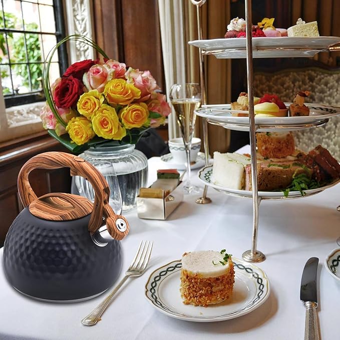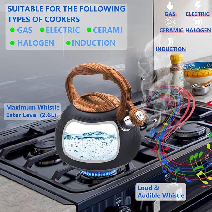 Tea Kettle Stovetop, 3.2 Qt Stainless Steel Whistling Kettle for Stove Top, Food Grade Teapot with Wood Pattern Handle for Coffee, Milk etc, Gas Electric Applicable (Black)