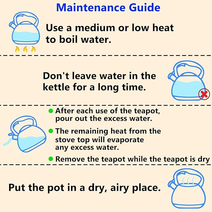 - 【Apply to Various Stovetops】The stove top stainless steel tea kettle is widely used in induction cookers and gas stoves, as well as other various stoves, such as electric ceramic stoves, halogen stoves, wood stoves, etc. When using an open flame to boil water, avoid using a large fire, the pot body is light and easy to heat, do not worry about slow speed.Clean the kettle immediately after use, keep the kettle dry inside and outside, cover and store in a dry place.