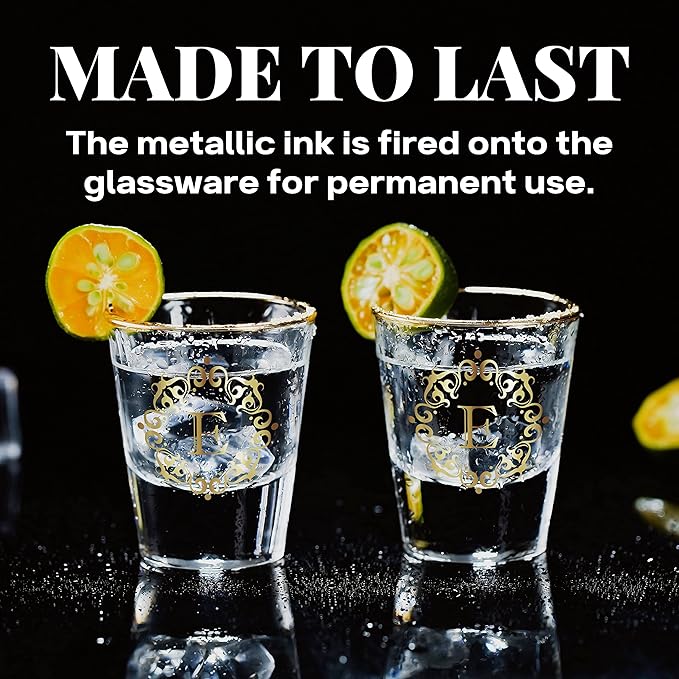 - FUN COLLECTIBLE: Give your glassware collection a little sparkle with this beautiful monogrammed gold-rimmed shot glass.