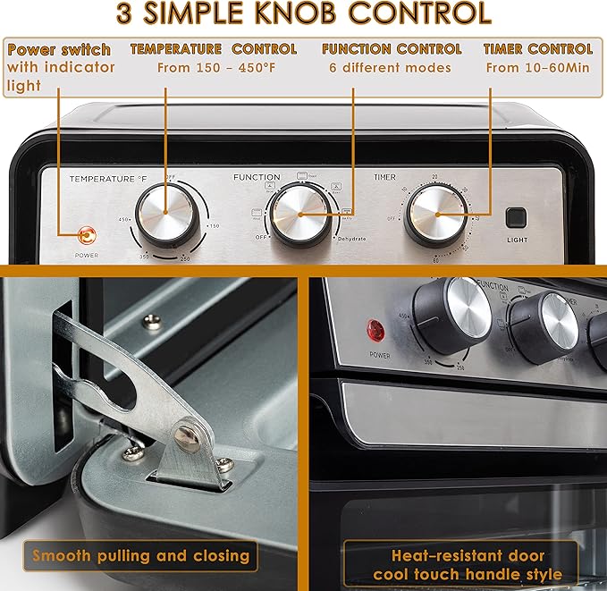 - High-efficiency Countertop Oven: 1700w motor multi-functional air fryer convection oven allows you to bake, broil, dehydrate, toast & air frying. Temperature suits up to 450F, with 3 knobs, enables you easy to select the demand cooking time, cooking method, and cooking temperature.