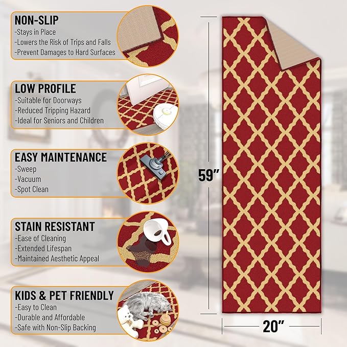 Ottomanson Hallway Runner Rug 20" x 59" Non Slip Trellis Area Rugs Easy to Clean Laundry Rug Runner Durable & Pet Friendly Floor Carpet Runners for Hallways Entryway Living Room Kitchen Bathroom, Red