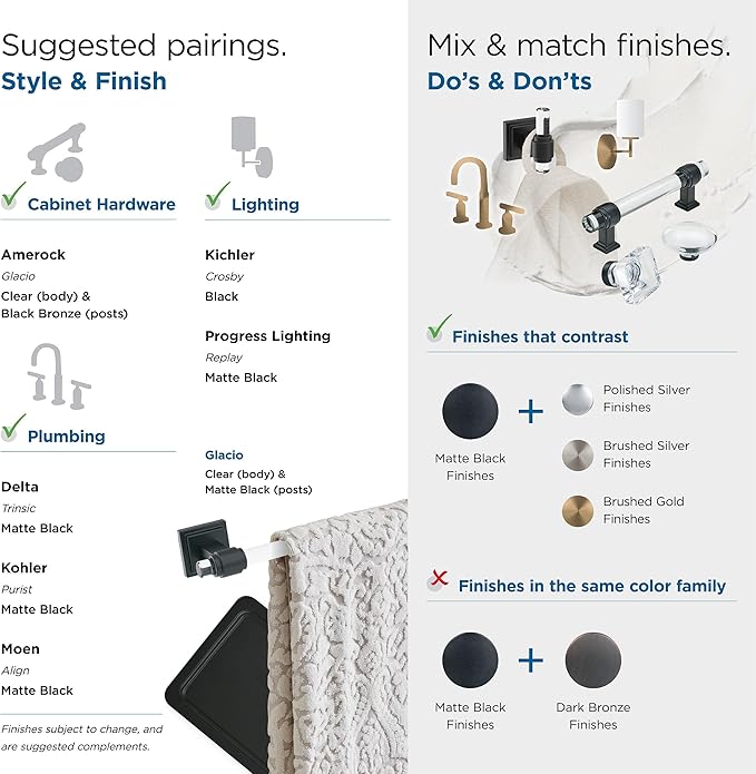 - Coordinate with: Matching cabinet knobs and pulls from Amerock Glacio collection for a cohesive designer hardware look