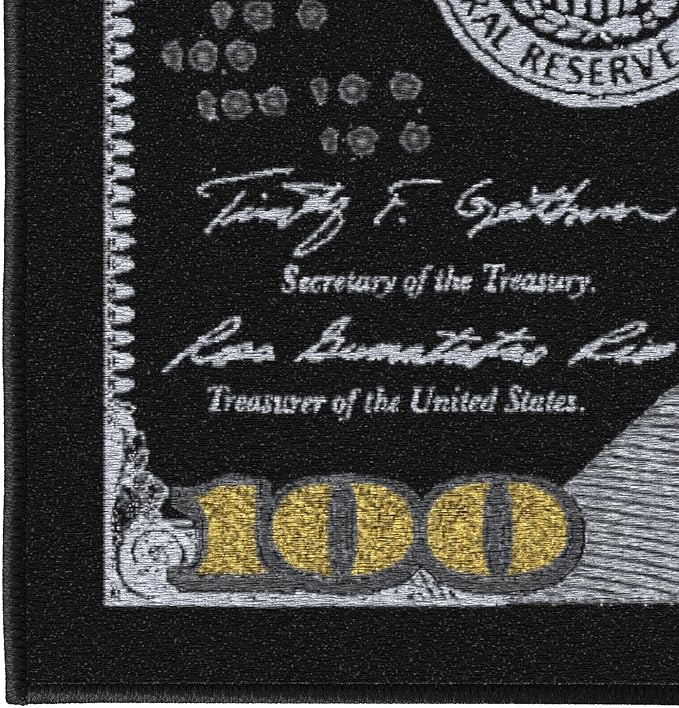 - [TRENDY STYLE]: This Colorful Money Money Rug features a 100 dollar bill print in shades of black, white, and gray with touches of gold while also adding color and enhancing the look of your home. Its timeless design can be integrated into a variety of home décor styles.