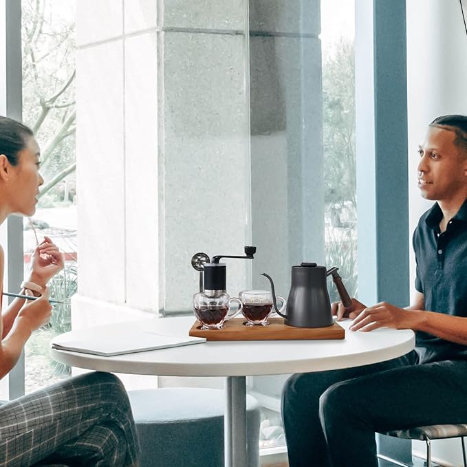 - 5 in 1 pour over set: This set includes a 28oz gooseneck coffee kettle with thermometer(easy to get your ideal temperature),hand grinder(enjoy diy coffee),stainless steel scoop(solid and elagant),2 thicended borosilicate glass cup and a wooden tray(for storage).