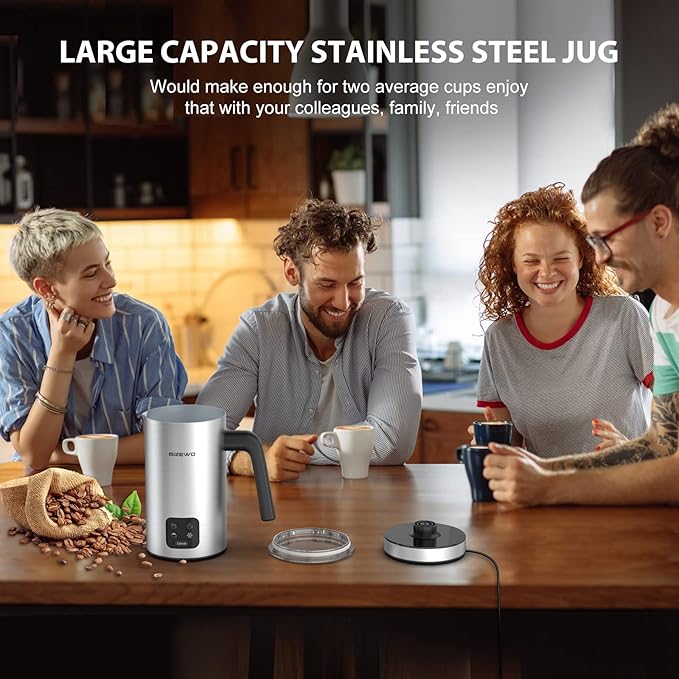 - Don't go back to handheld frother: In order to produce more stable milk foam, handheld milk frother often needs experience and touch, but BIZEWO Automatic Milk Frother can help people who have no barista experience
