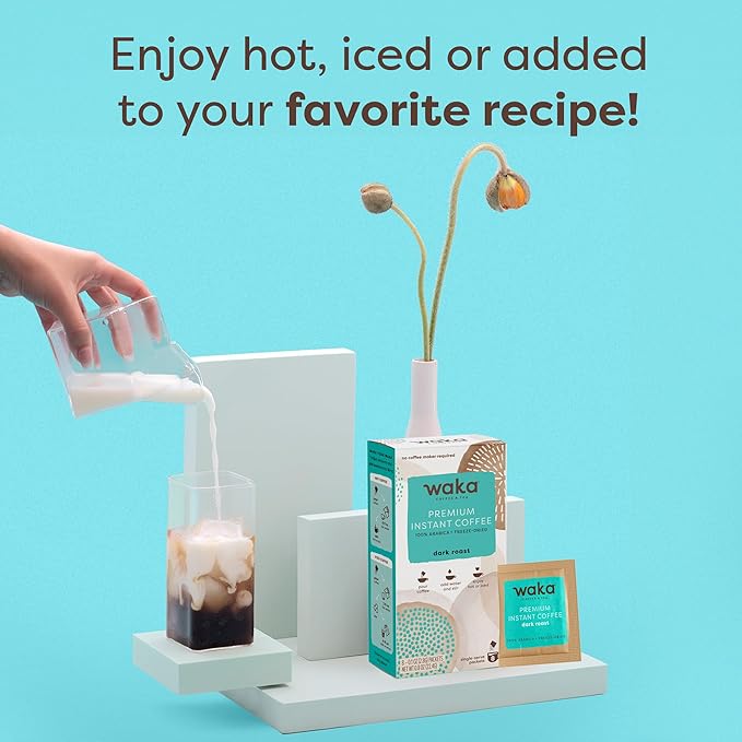 Waka Premium Instant Coffee Sachets — 100% Arabica Freeze Dried Beans — For Hot or Iced Coffee (8 Count, Dark Roast)
