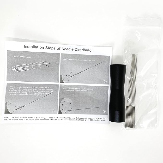 - Package Includes: A handle and 10 pins come separately in a box. The handle includes 8 slots to arrange, totally 10 pins(2 for spare use) CAUTION: When you first open the box, be careful not to hurt yourself since the needles are sharp and thin. NOTE: Since this coffee hand distribution tool needs to be installed, you can always contact us when you have any problems with it.(with english instruction)