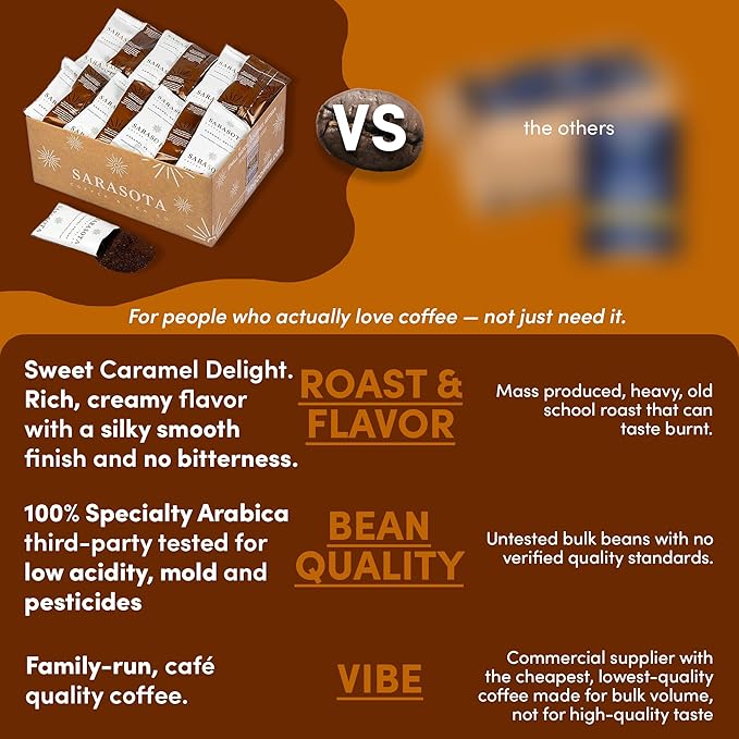 - CAFE-QUALITY, LOW ACID & MOLD FREE - Artisan roasted in small batches in Sarasota, FL using specialty-grade, low-acid Arabica beans. Clean, pure coffee with no chemical flavorings, no bitterness, and a naturally sweet caramel aroma. Taste exactly like your favorite café—without the price tag.