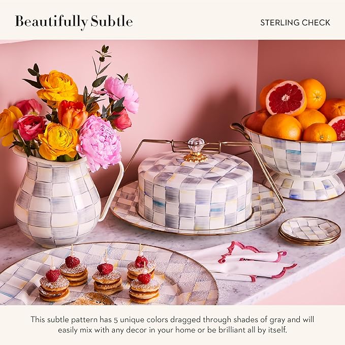 MACKENZIE-CHILDS Enamel Pitcher with Spout for Water, Cut Flowers, and Home Decor, 3 Quarts, Gray-and-White Sterling Check