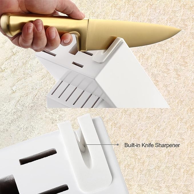 - A GOOD VALUE KNIFE SET- This golden knife set is sharp and well-made. The knives are durable and long-lasting, with a sturdy construction that prevents damage. The knives slice easily through ingredients without much effort, making meal prep simple. This knife block set has a nice look and is a fantastic addition to your kitchen.