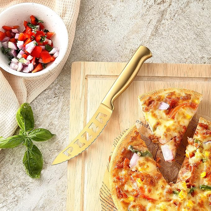 - A GOOD VALUE KNIFE SET- This golden knife set is sharp and well-made. The knives are durable and long-lasting, with a sturdy construction that prevents damage. The knives slice easily through ingredients without much effort, making meal prep simple. This knife block set has a nice look and is a fantastic addition to your kitchen.