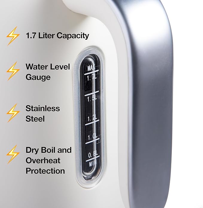 - Safe and Simple to Use - Our kettle is designed with auto shut off feature and boil - dry protection for your safety. If you forget that you turned on the kettle or accidently turned it on with no water it will automatically shut off. Base features cord compartment for neat storage.