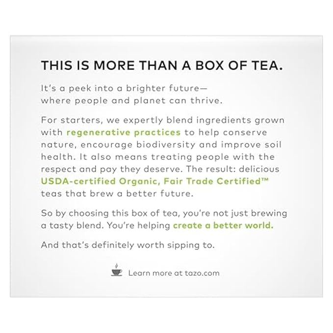 - CONVENIENT & VERSATILE: Use the organic tea bags to make breakfast tea or an afternoon pick-me-up; TAZO tea bags contain 31-45 mg of caffeine per 8 fl oz serving and best enjoyed hot or iced