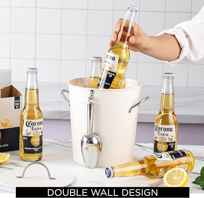 Rae Dunn Ice Bucket with Scoop - Stainless Steel Bucket with Handle, Lid and Ice Scooper - 4 Qt. Storage Bin for Ice Cubes for Bars, Parties, Backyard Barbeques, Picnics, and Camping (White)