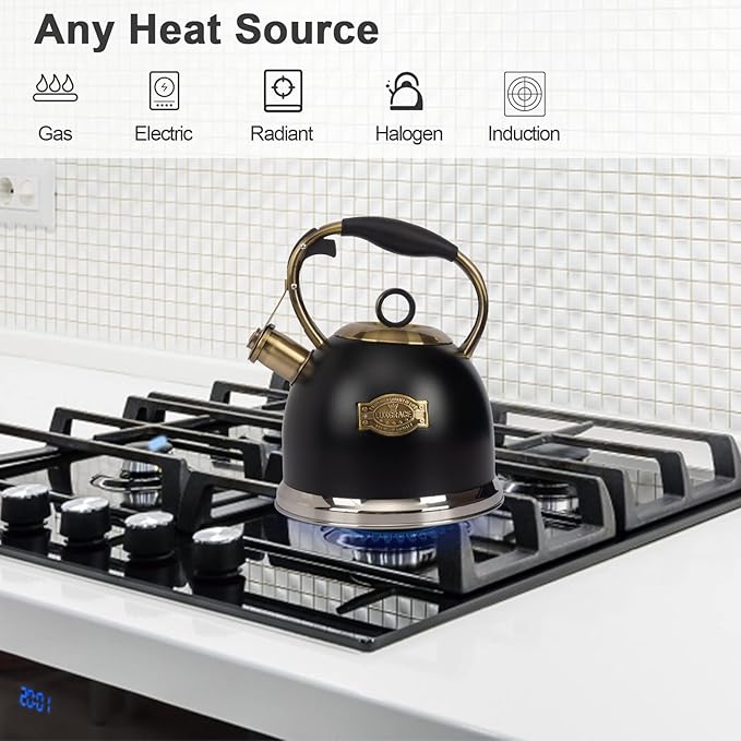 - Perfect Whistling Sound of Teakettle: This tea kettle for stovetop has a tight-fitting lid keeps steam in the hot tea kettle for rapid heating, and realse pleasant whistles sound when water reaches a boil, Loud enough to alarm you when you busy in the next room.
