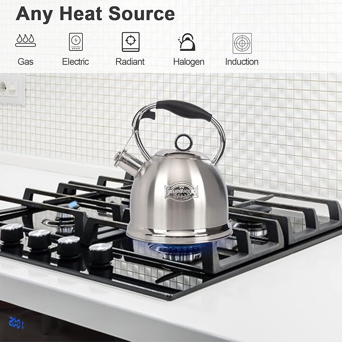 - Stainless Steel Design:Whole teakettle body are made of stainless steel, The thick body making it more durable and sturdy. 5-layer metal bottom with high thermal conductivity for more uniform heating and longer service life.