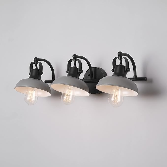 Globe Electric 52065 Gladstone 5-Piece All-In-One Bathroom Set, Matte Black, 3-Light Vanity Light with Matte Gray Metal Shades, Towel Bar, Towel Ring, Robe Hook, Toilet Paper Holder