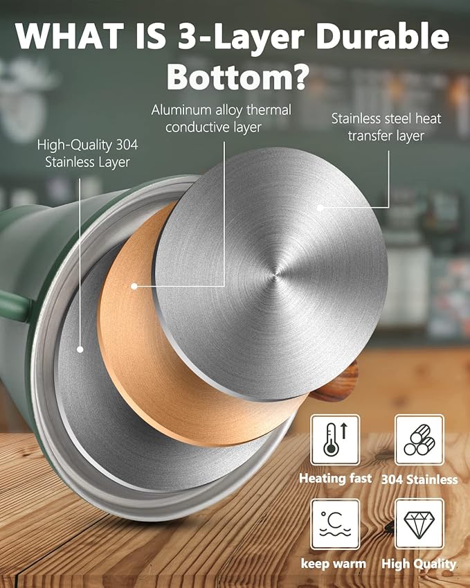 - Heat resistant handle ensures safety during pouring: Ergonomic resin handle with wood texture prevents slipping and burns; Lift and pour comfortably with bare hands for steady control; Included heat-insulating base protects the tabletop from burns
