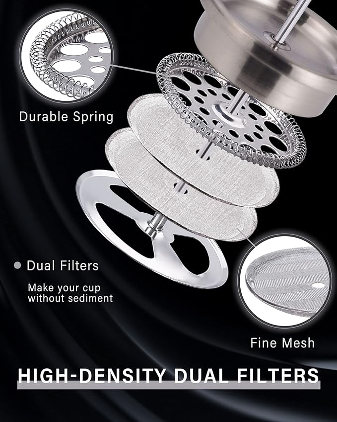 - DOUBLE WALL VACUUM INSULATION AND DUAL FILTERS - The double wall design of the french press coffee maker keeps coffee hot and the high-density dual filters structure can separate grounds from coffee perfectly, helping to make your cup without sediment and increase the smoothness of the brew. And the filters can be took apart easily for cleaning.