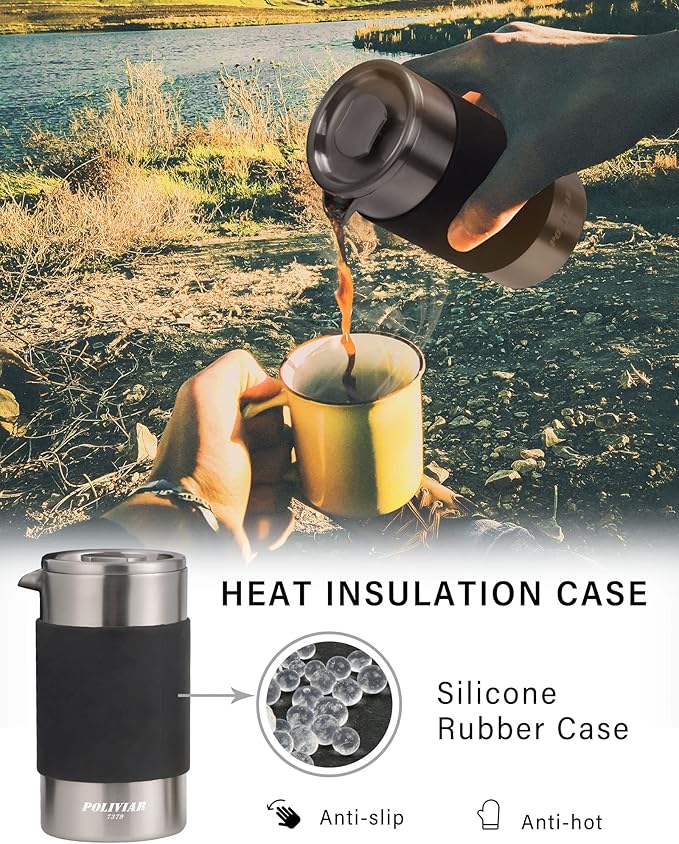 - PREMIUN QUALITY CRAFTSMANSHIP - POLIVIAR 12 OZ french press is made of 304 food grade stainless steel which is anti-rust and sturdy, taking care of user’s health and maintaining the pure taste of coffee without the metal taste when other pot does. With ergonomic designed handle,user can push and pull the plunger of coffee press easily. What is more, the travel french press with stylish long-lasting coating integrates beauty and practicality that it is a great gift idea for your friend, who is coffee lover.