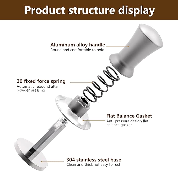 - 【Espresso Accessories for Better Coffee】This calibrated tamper provides approx 8kgs of optimal mashing power. By using this espresso tamper, you will get a flat concentric ring pattern in your portafilter. After tested, a concentric ring ground espresso coffee surface obtained approx. 8kgs strength then produces a better quality espresso, and the consistency of 8kgs of pressure will bring a great tasting coffee experience to you, let you like to date with it every day.