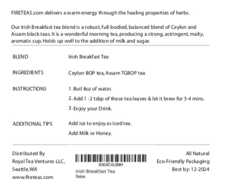 FIRE TEAS Irish Break Fast Tea - Loose Leaf Tea -