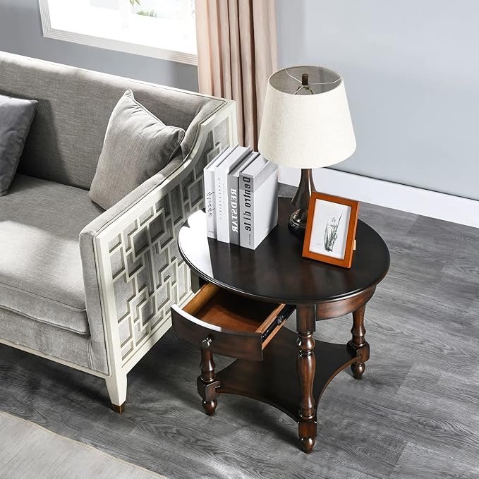 - Perfect Fusion Side Table: Combine form and function with this JESONVID oval end Table. The wood top oval shape offers enough of space while the high shelf and a extra drawer allows you to store more objects, books, and magazines. Adding this coveted side Table to your living room will offer a sophisticated place to show your exotic decor items, vases, showpieces and valuable collectibles.