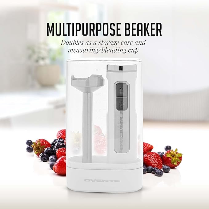 OVENTE Cordless Immersion Hand Blender, Rechargeable Handheld Portable Stick Mixer with 8 Mixing Speed Option, One-Touch Control and Stainless Steel Blades for Smoothies, Shakes or Soups, White HR781W
