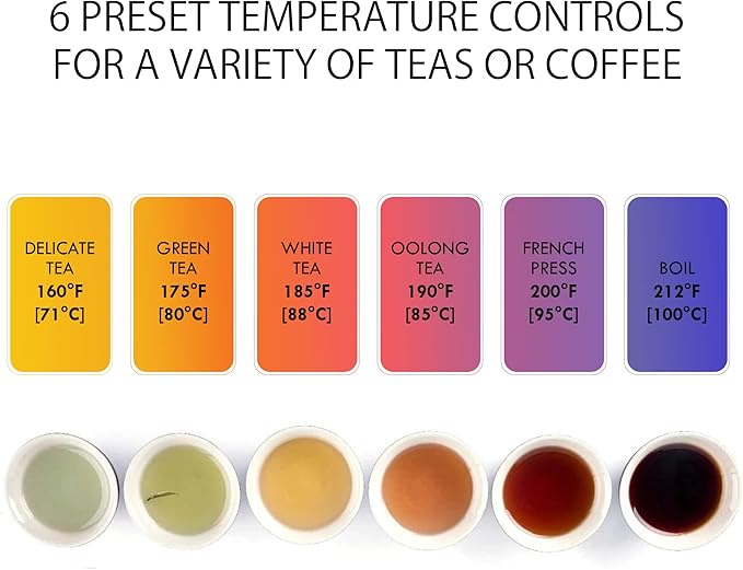 - EFFORTLESSLY BREW YOUR PERFECT CUP WITH COOL TOUCH CONVENIENCE - Simply touch the power button to activate the control panel, select from 4 presets or manually set your desired temperature, and wait for the kettle to beep twice, indicating your water is ready to pour and enjoy, all while the cool touch exterior ensures safe handling!