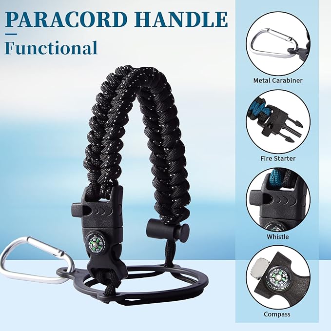 - PERSONALIZATION BOTTLE PARACORD HANDLE - Thermo water bottle with a pretty cool functional paracord handle which does more than meets the eye. The survival strap cord made of military grade nylon, with compass, safety loop, metal carabiner, flint, igniter and whistle. Can help you out if you were in a survival situation while hiking, camping or everyday life