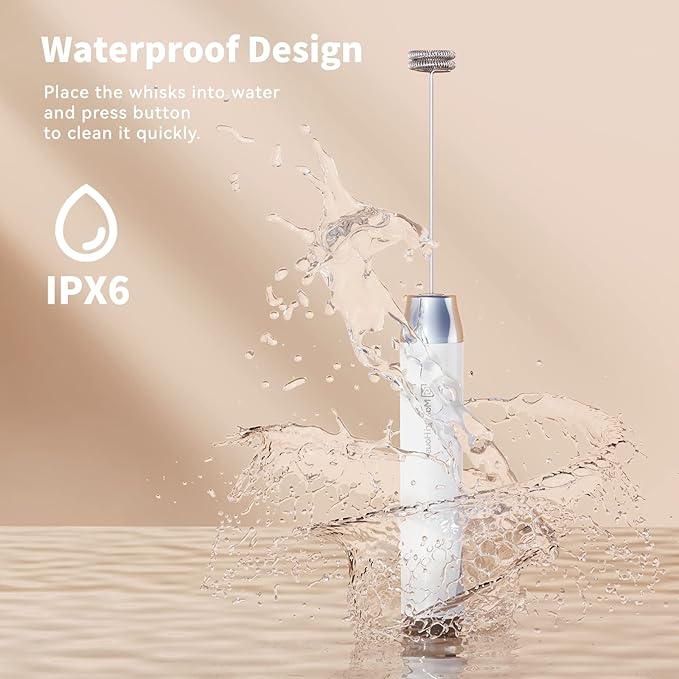 - One-button Operated Design: One press to start the whisking and another press to stop frothing. Just place the LunaFro handheld milk frother’s whisk into the container with milk or other liquid food, then press the button to make milk foam, and press the button again to stop working. It’s effortless to clean. Only put the mixing head into water or soapy water, and then press the button to let eddy water current clean it completely.